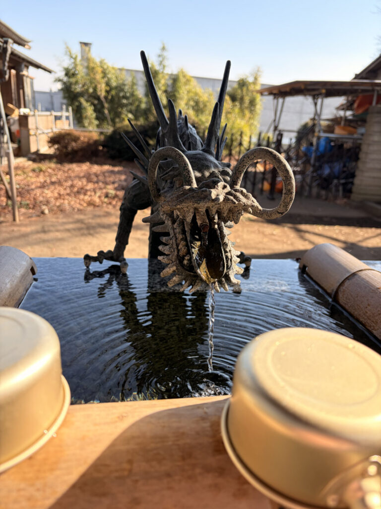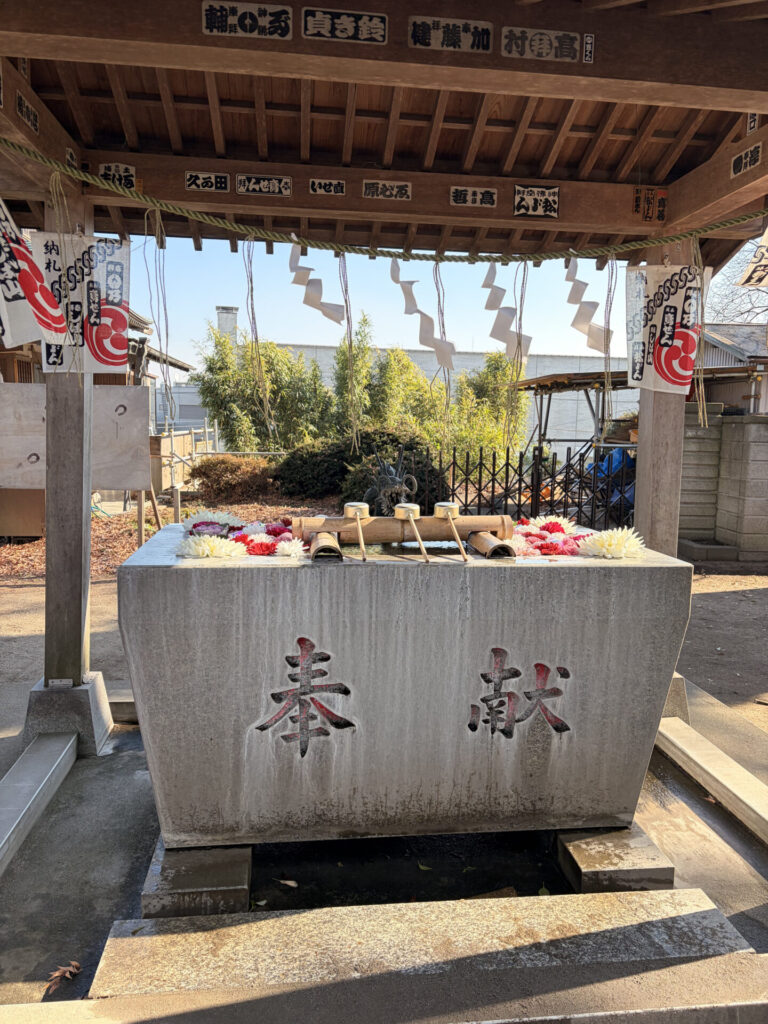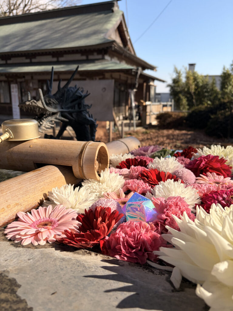 最近流行りの花手水がここにも! オーロラの球体が水面で光を拾って煌めいていました。