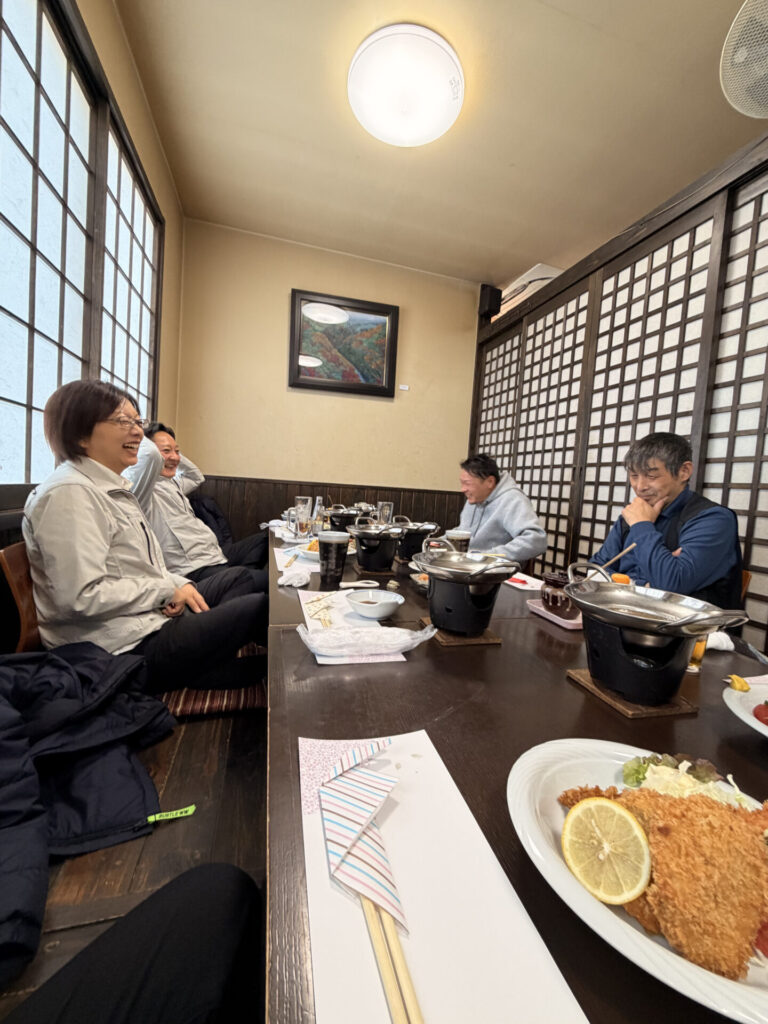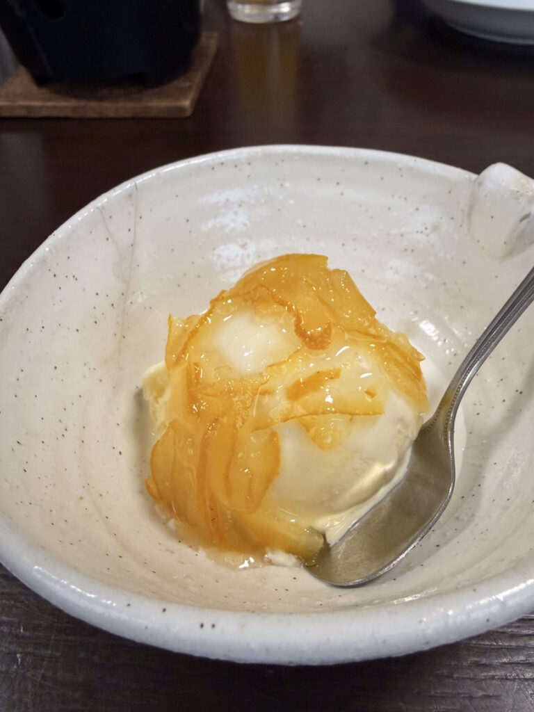 非常にボリューミーな献立で、先輩は早い段階から職人さんにお代わりを提供していましたが、デザートだけはやっぱり別腹のご様子。