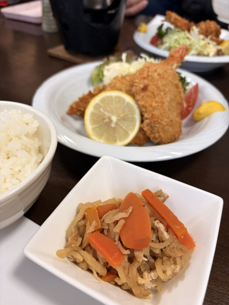 こんもりご飯にフライ2種、お味噌汁、小鉢というか大鉢の切り干し大根!